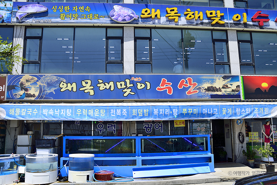 왜목마을 바닷가의 해양경찰서 왜목 출장소 옆에 있다. 1층은 산지 직송의 수산물 도·소매점, 2층은 횟집으로 널따란 홀의 유리창 너머로 왜목마을 앞바다가 한눈에 들어온다. 수산물 도소매점이니만큼 수족관에 유유히 헤엄치는 우럭이나 광어, 돔 같은 자연산 활어회가 주메뉴. 회가 리필되는 모둠회와 랍스터, 전복 등 각종 해산물과 곁들이 음식)을 포함한 스페셜 메뉴를 주문하면 이 집에서 가장 고급스러운 한 상을 받을 수 있다. 식사류로는 박속낙지탕, 해물탕, 간재미 무침, 회덮밥 같은 서해안의 대표 메뉴가 있고 제철에 간다면 전어나 대하, 새조개, 주꾸미 같은 계절 수산물 요리도 맛볼 수 있다. 가장 가볍게 먹기로는 해물 칼국수만 한 게 없다. 해물로 뽀얗게 국을 낸 해물칼국수는 시원한 국물 맛이 일품이며, 해물을 쏙쏙 골라 먹는 재미도 있다. 쫄깃한 면발을 입에 한가득 담고 아삭한 콩나물무침과 김치와 함께 먹으면 금상첨화다.
