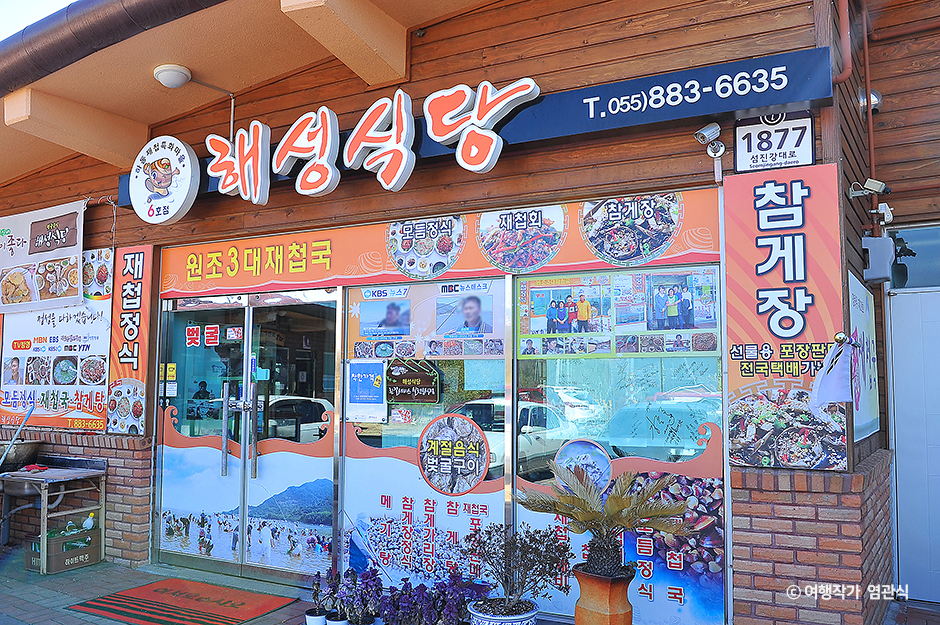 재첩이란 섬진강 하류에서 많이 나는 세모꼴의 작은 조개로 보통 국이나 숙회로 많이 먹는데, 하동 사투리로‘갱조래’라고 부르기도 하는데, 강에서 나는 조개를 가리킨다. 그밖에 재치, 다슬기 등으로도 불리는 민물조개로, 자라는 환경에 따라 조개의 색상이 달라진다. 5~6월이 제철로 특히 간 해독작용에 좋은 타우린이 풍부하여 해장국으로 사랑받는 식자재이다. 하동에는 재첩특화마을이 있는데 그곳에 많은 식당 중에서도 관광객들은 물론 현지 주민들도 자주 찾는 재첩 전문점이 해성식당이다. 가장 인기 있는 메뉴는 재첩 모둠 정식으로, 재첩국, 재첩 회무침, 참게장까지 세트로 한 상 차려진다. 재첩국은 몇 번이고 리필해준다. 전날 술을 마셨다면 두세 그릇은 금세 마셔버리는데, 하동의 재첩은 비리지 않고 재첩 특유의 향과 맛이 살아 있다. 재첩 회무침은 여러 가지 야채를 매콤한 양념으로 버무린 것 위에 재첩을 익힌 숙회를 푸짐히 올려서 내오는데, 같이 나오는 김에 싸 먹으면 한 접시가 금세 비워진다. 재첩 회무침을 밥과 비벼 비빔밥으로 먹어도 좋다. 같이 나오는 민물에 사는 참게로 만든 참게장은 짜지 않고 심심해해 밥도둑이란 명성답게 공깃밥 추가가 필수이다.