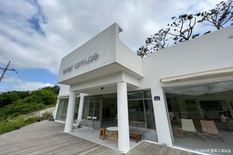 거제시 문동동에 있는 에버어뮤즈는 오션뷰를 자랑하는 거제의 다른 카페들과는 달리 산과 호수를 조망하는 장소에 있다. 푸르른 산과 대비되는 새하얀 건물로 들어서면 넓고 탁 트인 공간이 나타난다. 채광이 좋은 오픈형 카페이며 아늑하고 따뜻한 분위기가 공존한다. 테이블 간격이 넓어 조용하고 여유로운 분위기를 즐길 수 있고 내부 곳곳에 있는 식물과 감각적인 소품들이 인테리어의 감성적인 느낌을 더한다. 브런치로는 바질, 리코타, 연어, 베리가 올라간 오픈 샌드위치와 새우 까르토쵸가 있다. 이 외에도 스콘, 빅토리아 케이크, 요거트볼 등을 직접 만들어 판매하고 있다. 인근에는 문동폭포, 망치 몽돌해수욕장, 학동 몽돌해수욕장 등이 있다.