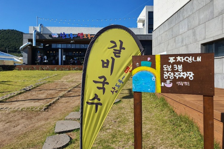 산도롱맨도롱은 제주 종달리에 있는 갈비국수 맛집이다. 멀리는 성산일출봉까지 보이는 바다를 바라보며 경치 한 입, 국수 한 입 함께 즐길 수 있는 운치 있는 식당이다. 두툼한 제주산 우대 갈빗살을 양념하여 국수 위에 푸짐하게 올린 갈비국수로 유명한데 취향에 따라 매콤한 홍갈비국수와 진한 백갈비국수를 골라 먹을 수 있다. 아침 식사도 가능하며 야외 테이블에는 반려 동물도 함께 출입할 수 있다. 손님이 많아 기다려야 하는 경우도 있지만 회전율이 높고, 예약 시스템을 이용하면 웨이팅 시간을 최소화할 수 있다.