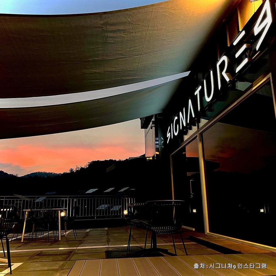 시그니쳐9은 성남시 수정구 상적동에 있는 베이커리 카페이다. 1층부터 4층까지의 건물로 꼭대기는 루프탑이며, 주차장이 넓다. 통유리로 바깥의 풍경을 볼 수 있다. 엘리베이터가 있어 각층 이동 시 편리하다. 1층에는 야외 테라스 자리가 있다. 2층에는 룸이 있으며 통유리를 통해 저수지를 볼 수 있다. 다. 3층 야외 테라스 자리에서는 저수지가 잘 보인다. 4층은 루프탑으로 야외 테라스 자리가 인기가 좋다. 많은 종류의 빵과 다양한 음료, 수프와 파스타, 샌드위치와 파니니, 토스트, 감바스 등을 주문할 수 있다. 카페는 21시까지이나 브런치 운영 시간은 10:00~18:00까지이다. 베이커리는 100% 캐나다산 유기농 햇밀만 사용하여 일반 밀가루 빵보다 아토피, 알레르기 우려가 적고, 바삭함과 고소함이 뛰어나다.