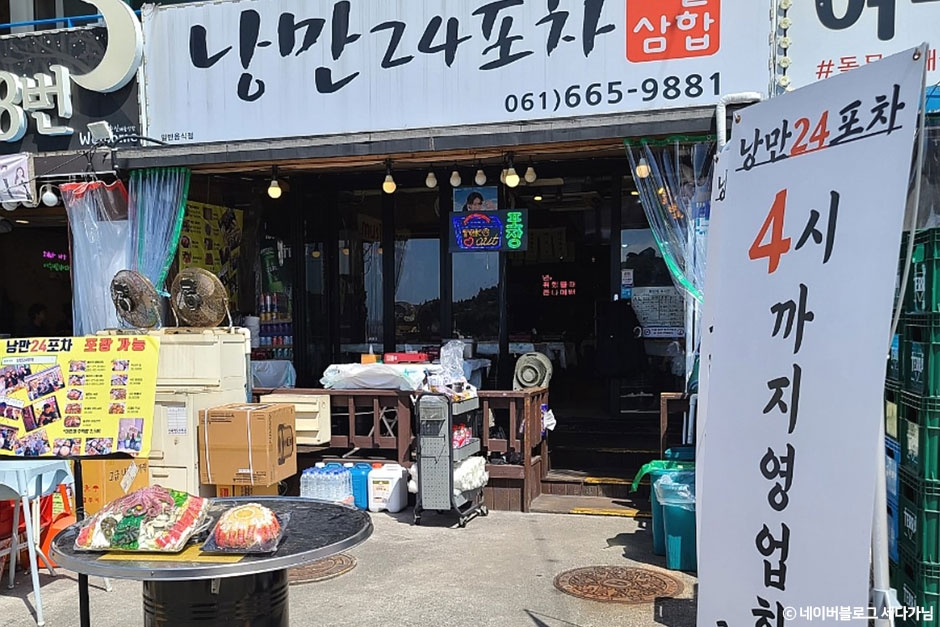 여수 하멜전시관 근처에 있는 낭만24포차는 포차들이 몰려 있는 여수 낭만포차 거리에서 맛과 친절도가 모두 높기로 유명하다. 대표 메뉴인 돌문어 삼합은 한옆에 대패 삼겹살이 올려져 있고, 중앙에는 한 번 삶아져 나온 돌문어와 왕새우, 관자, 소라가 세팅되어 나온다. 해물들을 손질해준 후에는 밑에 있던 김치와 콩나물들을 돌문어, 버섯, 전복과 함께 잘 섞어서 볶아준다. 밑반찬은 돌문어 삼합과 어울리는 반찬들로 무 쌈, 돌산갓김치, 깻잎장아찌 등이 나오는데 무 쌈과 깻잎에 잘 익은 돌문어와 채소를 함께 먹으면 별미다. 단체석과 주차장도 구비되어 있다.