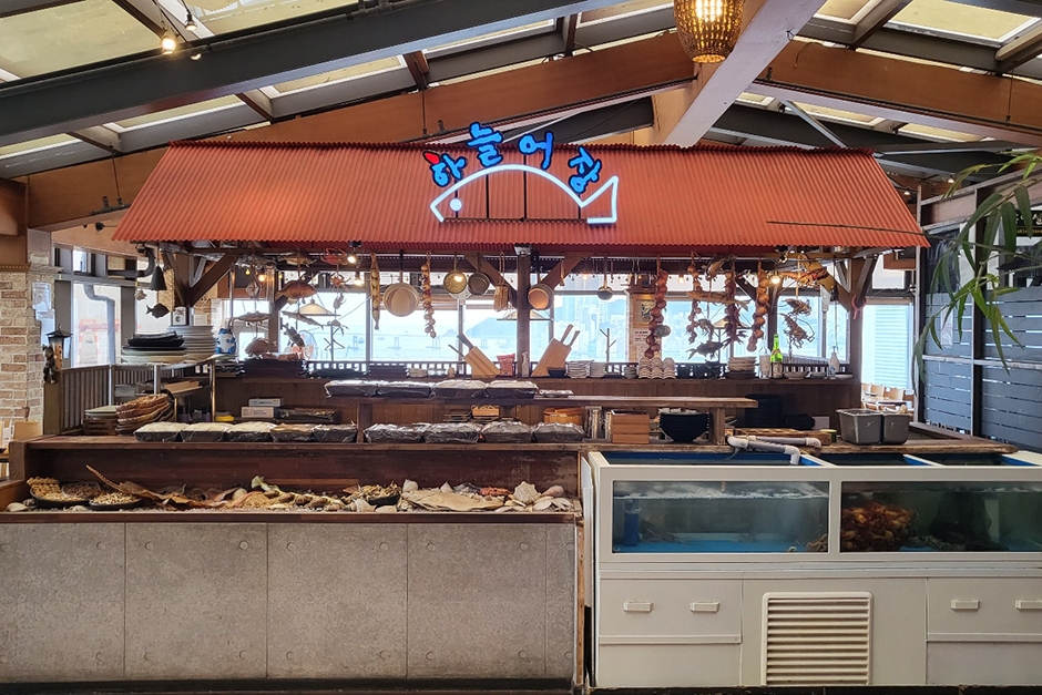 부산 남포동에 있는 하늘어장은 해산물 전문점이다. 건물 13층에 있어 창가 쪽에 앉으면 남항대교와 바다를 전망할 수 있다. 넓은 내부는 칸막이로 테이블이 분리되어 있고, 가게 중앙에 수족관과 주방이 있어 이색적인 분위기를 연출한다. 기본 2인, 3인, 4인, 5인 기준의 모둠회, 해산물 (멍게, 개불), 기본 안주 4종, 매운탕이 나오는 코스요리가 준비되어 있다. 메뉴 구성이 좋아 데이트 코스, 회식, 모임 등 다양한 모임에 적당하다. 단품 메뉴로 산낙지, 전복, 돌문어 숙회, 생우럭 매운탕, 왕새우 튀김이 있고, 식사류로는 초밥, 멍게비빔밥, 김치마끼, 어린이가 먹을 수 있는 돈가스 등 다양하게 준비되어 있다. 근처에 남포역과 자갈치역이 있고, 부산 여행 코스에 빠지지 않는 자갈치시장이 있어 연계 여행하기에 수월하다.