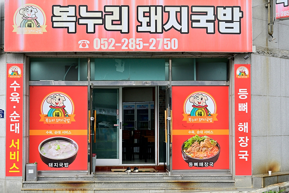 울산 호계에 위치한 돼지국밥집이다. 국밥 육수는 100% 사골로 고아서 만들며 맛보기 순대와 수육을 서비스로 제공하고 공깃밥도 추가 요금 없이 먹을 수 있다. 소면, 고추, 마늘, 된장, 고기 양념장, 김치 등 밑반찬이 부족하면 셀프 바를 이용하면 된다. 빨간 양념장, 후추, 새우젓은 취향 별로 선택할 수 있다. 맛도 좋은데 가격대가 비교적 저렴한 편이어서 가성비가 뛰어나다. 별도 주차장이 없어 주택가 골목길에 주차해야 한다. 화동못 수변공원, 당사 해양 낚시공원이 인접해 있어 함께 둘러보기 좋다.