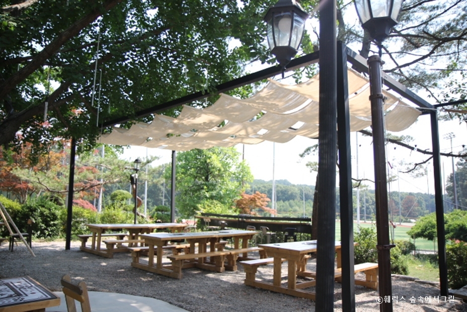 숲속에 그릴은 훼릭스야구장 근처에 있는 숲속에서 고기를 구워 먹는 식당이다. 매장 앞에 주차할 수 있는 공간이 있지만 협소한 편이다. 이 식당은 주말, 주중 개인 예약은 따로 받지 않고 오는 순서대로 안내해 준다. 단, 주중 20~50명 이하의 단체 손님은 전화로 예약하면 된다. 숲속에 그릴은 기본 고기 주문 후 자리 배정을 받게 된다. 그 후 기본 상차림이 나오면 추가 주문할 수 있다. 추가 반찬은 건물 내 셀프 코너를 이용하면 되고 주문 후 이용 시간은 2시간이다. 항상 대기가 있는 곳이라 대기 할 수 있는 공간에 의자와 평상이 준비되어 있고 어린이를 위한 미끄럼틀, 그네도 준비되어 있다. 이곳은 매일 500인분 한정판매로 운영하고 있고 반려동물은 동반할 수 없다.