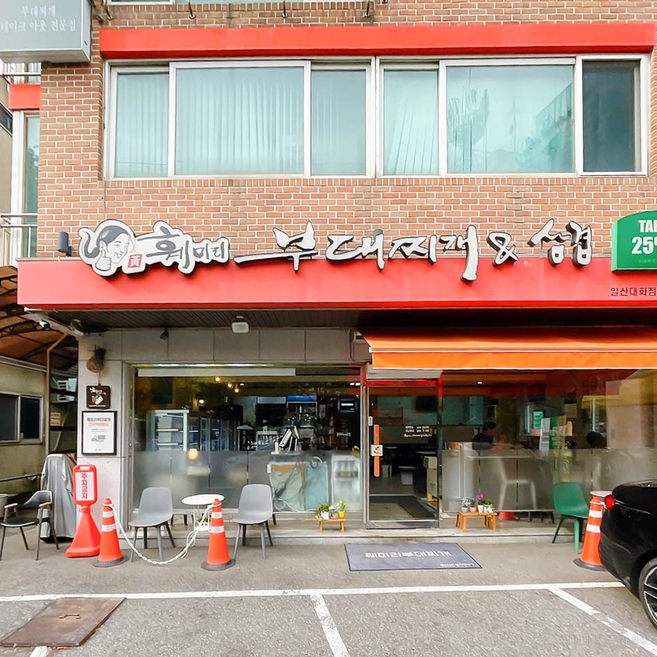 훼미리부대찌개&생삼겹은 일산서구 대화동에 있는 부대찌개 전문점이다. 매장 앞에 3~4대 정도 주차가 가능하고 내부는 깔끔하고 산뜻한 느낌이다. 매일 신선한 식재료를 이용한 부대찌개 메뉴는 프리미엄, 스페셜, 오리지널, 클래식 부대 볶음 등 4가지가 있는데 프리미엄 부대찌개에는 미나리와 각종 채소와 여러 가지 햄과 버섯 위에 차돌박이가 올려져 있고 육수 맛이 깊고 진하다. 어느 정도 끓여지면 공깃밥과 같이 먹으면 된다. 세트 메뉴도 있고 포장 시 할인도 해준다.