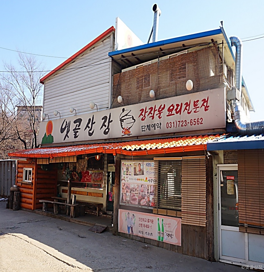청계산 근처에 있는 옛골산장은 장작불에 초벌구이 되어 나오는 흑돼지 바비큐가 대표메뉴이다. 고기류 외에 전골류, 식사류, 안주류로 구분된 다양한 메뉴가 있다. 본관과 별관으로 구분되어 있고, 200석 정도 되는 단체 연회석이 있고, 대형주차장도 마련되어 있다. 또한 인조 잔디로 된 족구장 코트가 3개 있고, 빔프로젝트와 간단한 무대도 있어 단체 모임 및 각종 야유회 행사를 하기에 적합하다. 미리 요청하면 15인승 차량 운송 서비스도 제공받을 수 있다. 곁들임 반찬으로 나오는 유기농 채소는 991㎡(300여 평)의 텃밭에서 직접 재배한 것이다. 매년 12월에는 직접 재배한 배추로 2천 포기의 김장을 하고 1년 뒤에 손님상에 올린다.