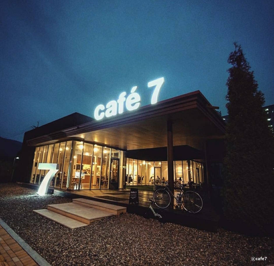 cafe7은 수원시 권선구 금곡동에 있는 카페이다. 건물 뒤쪽에 넉넉한 주차 공간이 있어 주차를 편하게 할 수 있다. ㅁ자 모양의 건물에 외관이 통창으로 되어 있는 이곳은 작은 정원 주변으로 테이블이 여럿 있다. 깔끔한 내부 곳곳에는 아기자기한 소품들로 꾸며져 있고 다양한 크기의 테이블이 곳곳에 있어 많은 인원을 수용할 수 있다. 이곳은 lily 커피를 사용하고 있다. 아메리카노, 라테, 아포가토 등의 커피음료와 자몽주스, 히비스커스 등의 다양한 음료가 있고 바스크 치즈케이크, 와플 등의 디저트류가 준비되어 있다. 마지막 주문은 21:30분이며 유아 및 어린이 동반 입장이 제한되어 있다.