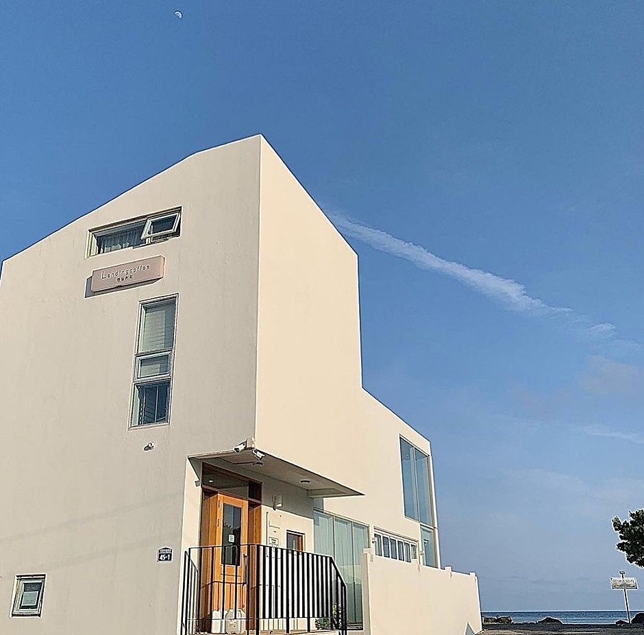 랜딩커피는 신양섭지해수욕장과 나란히 있다. 인테리어와 아웃테리어가 바다라고 해도 과언이 아닐 정도로 통창과 오션 뷰가 특징이다. 공간은 폭이 좁고, 하얀색 벽과 천장, 옅은 색 테이블과 의자를 놓았고, 2층은 바다 조망을 위해 테이블을 일렬로 배치하고 어린이 제한 구역으로 운영 중이다. 시그니처 음료인 아일랜드 티는 붉은 과일을 써서 색감이 드러나고, 코코넛밀크가 들어간 카페모카와 장난감같이 생긴 무스케이크 등 사진찍기 좋은 카페이다. 주변 여행지로 섭지코지가 있다.