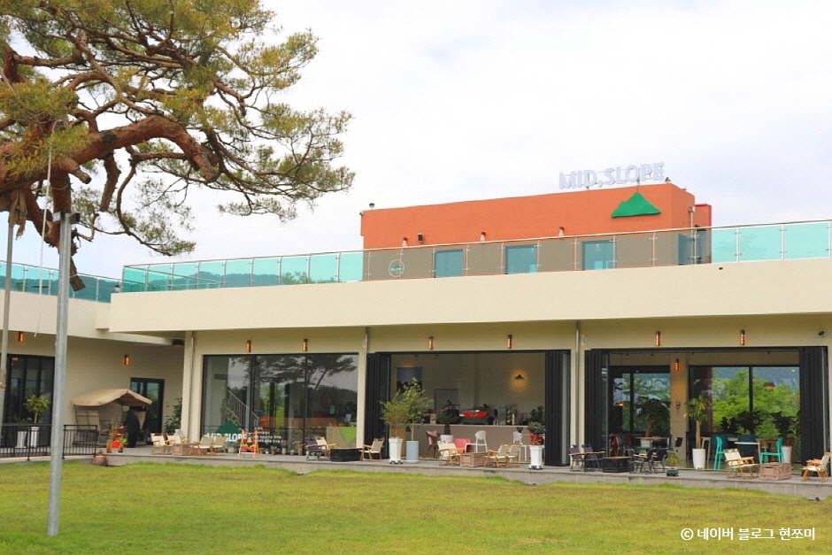 넓은 마당에 소나무 한 그루, 산 중턱이라 자연 그대로의 푸릇푸릇함을 눈에 담을 수 있는 카페이다. 주차 공간도 넓다. 자연 속에 있기 때문에 지정된 흡연구역 이외에는 금연이다. 넓은 잔디밭에 야외석도 있고, 카페 내부도 자리 간 간격이 넓어서 여유롭게 숨 고르며 차 한 잔과 휴식을 즐길 수 있는 곳이다. 2층 루프탑도 이용이 가능하나 8세 미만의 아이들은 부모님 동행 하에만 출입이 가능하다. 안쪽으로 길게 이어지는 직사각형의 내부 공간 가운데에는 디저트류가 진열되어 있고 테이블들이 뒤쪽으로 있어 편안한 자리에서 자연을 감상하기 좋다.