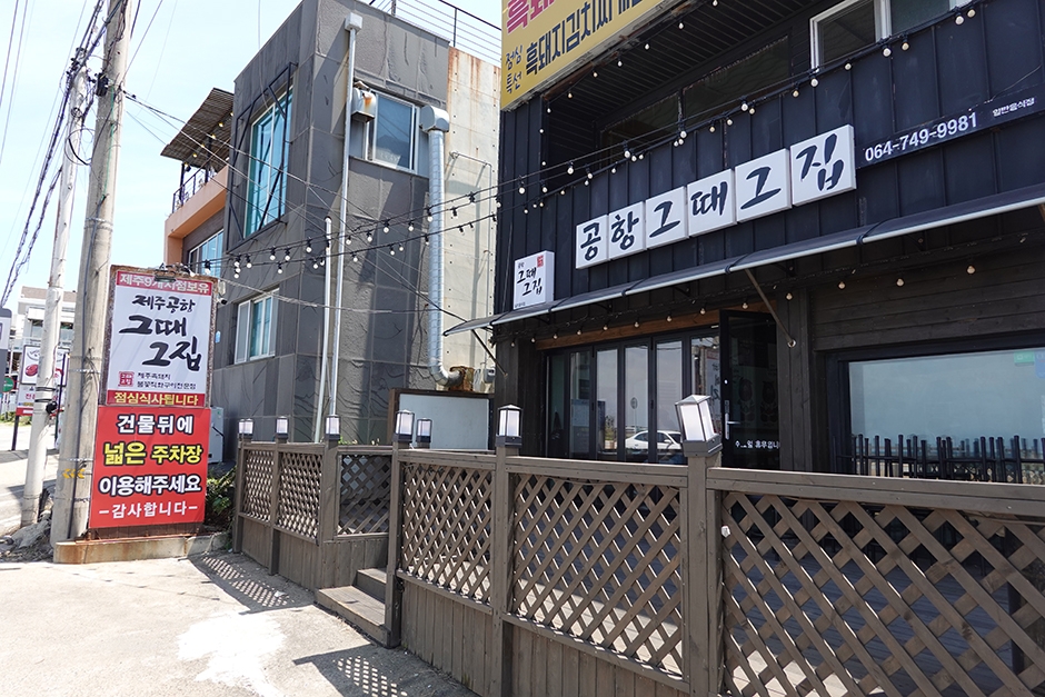 제주공항그때그집은 용담 해안도로 사수항 근처에 있다. 바다가 보이는 흑돼지 전문점으로 제주에서 유명한 그때그집 본점의 직영점이다. 인기 있는 흑돼지 세트 메뉴에는 흑돼지 오겹살, 목살, 새송이버섯, 고사리, 소시지, 양념게장과 흑돼지 김치찌개가 포함되어 있어 가격 대비 푸짐하다. 점심 특선인 흑돼지 김치찌개를 주문할 경우 무한리필이며 라면 사리, 철판 계란프라이가 포함된다. 주변 여행지로 무지개 해안도로, 도두봉 등이 있다.