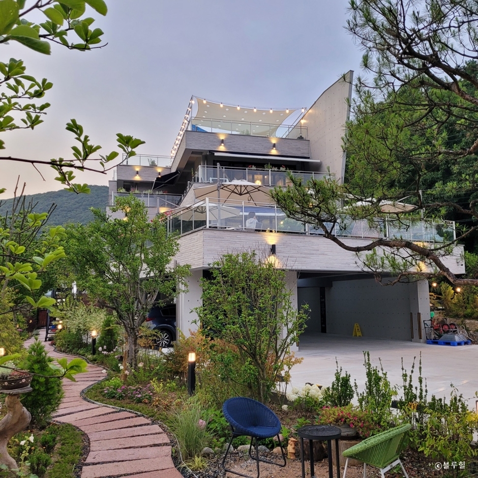 블루힐은 남한산성로에 있는 레스토랑과 카페를 운영하는 곳이다. 단독건물로 건물 1층과 앞에 주차장이 넓게 있어 편하게 주차할 수 있다. 블루힐은 1층에 조경이 잘 되어 있는 분수 야외정원이 있고 곳곳에 야외 테이블이 배치되어 있다. 2층과 3층은 실내 매장으로 깔끔하고 넓으며 다양한 크기의 테이블이 배치되어 있고 테라스에도 자리가 있다. 4층 루프탑도 있어 많은 인원을 수용할 수 있다. 카페 레스토랑 이용고객은 2층 매장 카운터에서 먼저 주문 및 결제 후 자리를 잡으면 되고 레스토랑은 음식을 서빙해준다. 음료와 디저트는 셀프로 이용해야 하며 4층 루프탑은 음료, 식사 손님 모두 이용할 수 있지만 모두 셀프로 이용해야 한다. 이곳은 엘리베이터가 설치되어 있어 이동이 불편한 손님들도 편하게 이용할 수 있으며 1층 야외정원과 2~3층 야외테라스, 4층 루프탑은 반려동물을 동반할 수 있다.
