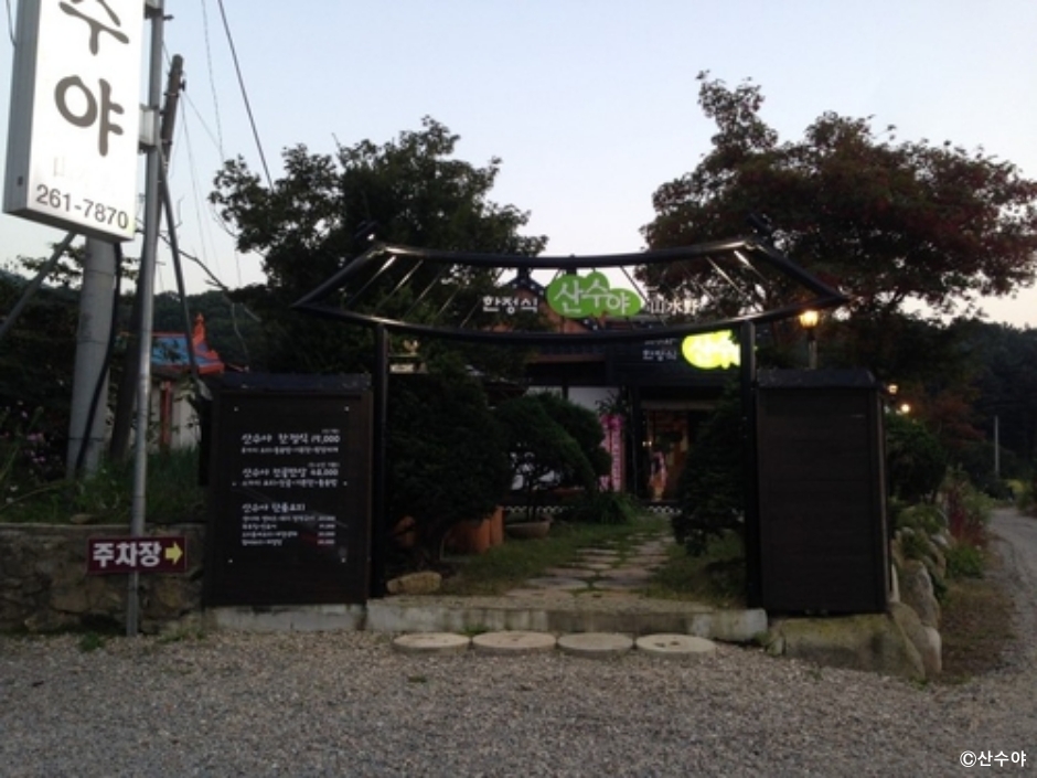 산수야는 강원도 춘천시에 있는 한정식집이다. 방문하는 고객 수에 따라 가격이 달라지는 집이다. 정식은 2인 이상만 가능하다. 기본반찬으로 오리무침, 꽈리고추찜, 애호박들깨볶음, 배추김치, 도토리묵, 감자조림, 된장국이고 요리로는 주꾸미볶음, 떡갈비, 단호박튀김과 새우튀김, 해파리냉채, 표고탕수 등이 나온다. 밥은 가마솥 밥이다. 요리는 더 먹고 싶으면 별도로 주문할 수 있게 추가 메뉴가 있다. 예약은 가능하나 3인 이상만 된다. 좌석은 넓은 편이고 좌석과 좌석 사이에는 흰색 천으로 만든 3단 파티션이 있어 공간 분리도 되고 단아한 느낌을 준다. 상가 건물 2층에 있는 식당이라 주차장이 넓지는 않지만, 별도 주차장이 있다. 건물 주변 골목에도 주차를 할 만한 공간이 있다.