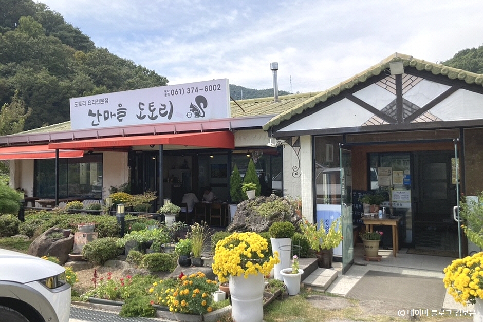 산마을도토리는 도토리 요리 전문점이다. 한적한 시골길 골목 끝에 있으며 건물 외관은 아기자기한 분위기이고 건물 앞에 꽃과 풀들이 예쁘게 꾸며져 있다. 전용 주차장이 있지만, 주차 공간이 넉넉하지 않아 갓길에 주차하는 경우도 많다. 점심시간에는 대기해야 할 만큼 많은 손님이 찾는 곳이다. 내부는 넓은 편이며 인테리어가 깔끔하여 음식 맛을 돋운다. 도토리 요리 전문점답게 다양한 도토리 요리를 맛볼 수 있으며, 그중 도토리해물파전이 이 집의 대표 메뉴다. 주변에 테마파크소풍, 키즈라라, 화순고인돌유적 등이 있어 연계 관광하기 수월하다.