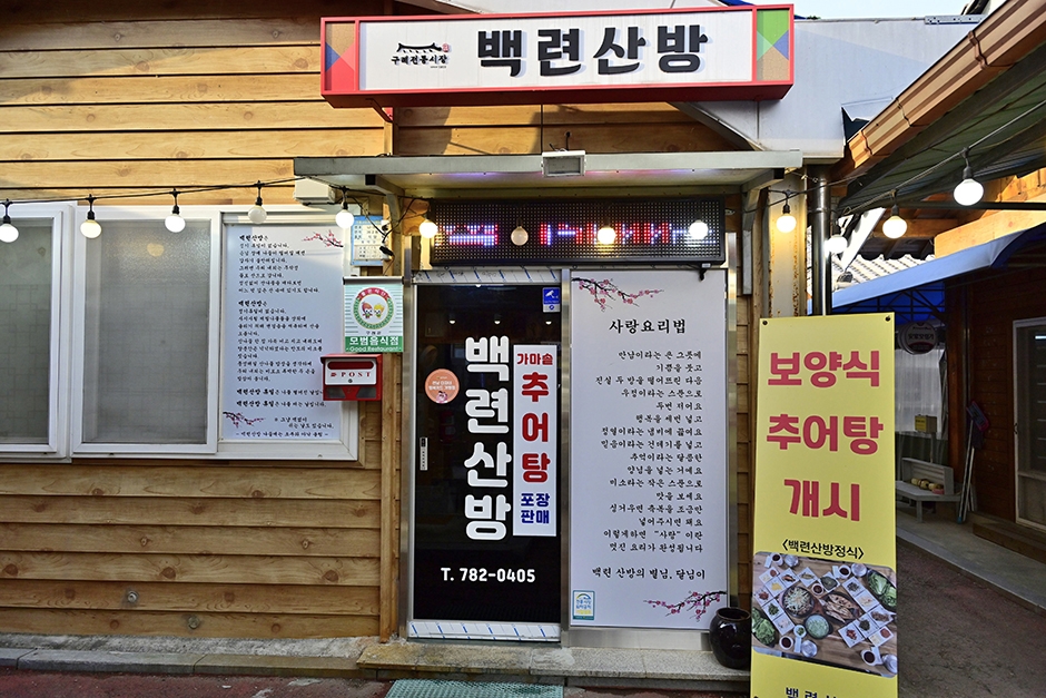구례읍 5일 시장 내에 있는 한식당이다. 예약제로 운영되며 손님이 많아 재료 소진 시 영업시간보다 일찍 문을 닫을 수 있으니, 방문 전 전화 예약이 필수다. 주차장이 넓어 방문하기 편리하다. TV 프로그램 생방송오늘저녁에 소개된 바 있다. 과거에는 사찰음식 전문점이었던 곳인 만큼 건강한 밥상을 선보인다. 이 집의 대표 메뉴인 백련산방 정식을 주문하면, 10여 가지 반찬과 석쇠불고기, 생선구이, 재첩국 세 가지 메인 메뉴가 한 상 가득 차려진다. 곡성섬진강천문대, 섬진강 대나무 숲길 등이 주변에 있어 연계 관광하기 수월하다.