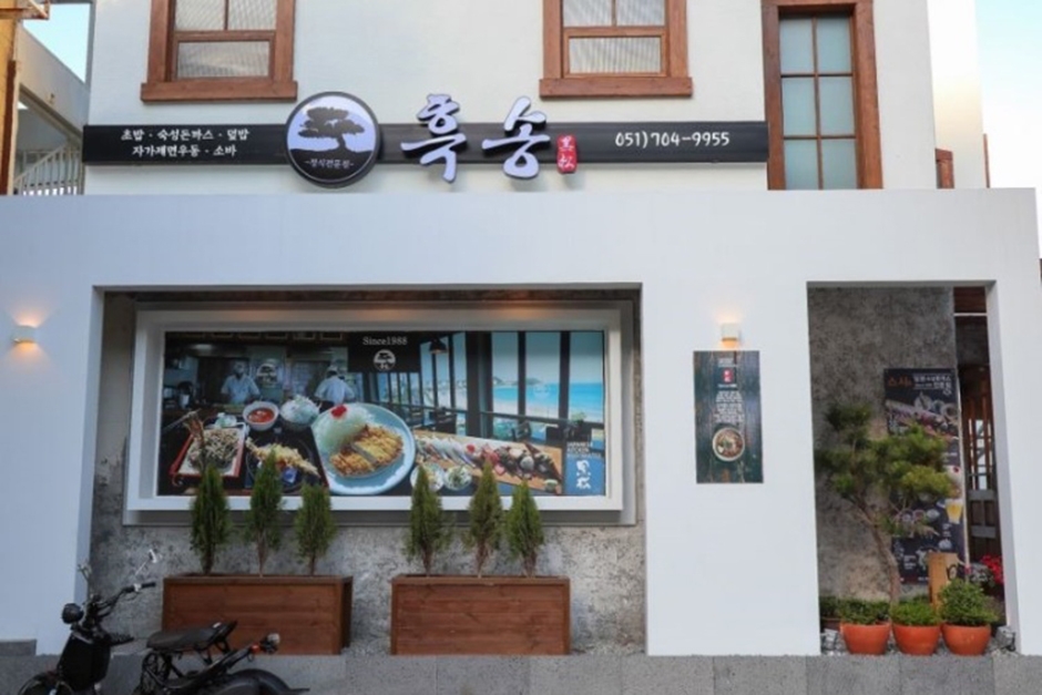 부산 해운대 송정 해수욕장 근처에 있는 흑송은 유명 호텔 출신 일식 주방장이 운영하는 스시, 돈가스 전문점이다. 검은 소나무라는 뜻의 흑송은 송정 바다 풍경을 보며 음식을 먹을 수 있는 곳으로 1층 작은 문으로 나가면 테라스가 있어 대기하는 동안 바다를 볼 수 있다. 1, 2층 창가 쪽 자리는 바다 풍경이 보여 인기가 많지만 따로 예약이 불가하고 오는 순서대로 앉는다. 가성비 좋은 런치세트는 10종 스시와 유부초밥, 샐러드, 튀김, 미니 우동이 나오고 주말, 공휴일은 제외이다. 흑송 대표 메뉴 돈가스는 숙성 돼지고기를 바삭하게 튀겨 도톰하고 육즙 가득 풍미 가득하여 부산 3대 돈가스 맛집으로 자리 잡았다. 주말 점심시간에는 사람이 많아 브레이크 타임 전 입장이 불가능할 수 있어 여유 있게 미리 가서 기다리는 게 좋다. 근처 걷기 좋은 해수욕장과 수려한 해안 절경을 볼 수 있는 해변 열차 블루라인 파크도 있어 함께 방문하기 좋다.