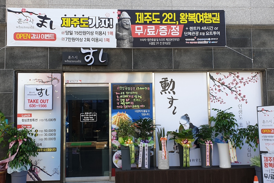 거제 고현에 있는 코스 요리 전문점 훈스시는 내부가 원목으로 꾸며져 깔끔하고 여러 명이 가더라도 오붓하게 즐길 수 있는 프라이빗한 룸이 마련되어 있어 편리하다. 인원수에 맞춰 주문할 수 있는 코스요리는 샐러드, 물회, 사시미, 참치, 랍스타, 참치가마구이, 돌판구이, 탕, 튀김 등 다채로운 메뉴 구성과 합리적인 가격으로 각종 모임 예약하기 안성맞춤이다. 모듬참치와 참다랑어, 랍스타, 메로구이 등 단품 메뉴도 다양해 선택의 폭이 넓다. 전용 주차장이 있으며 거제 관광모노레일과 거제식물원 등이 인접해 있어 함께 둘러보기 좋다.