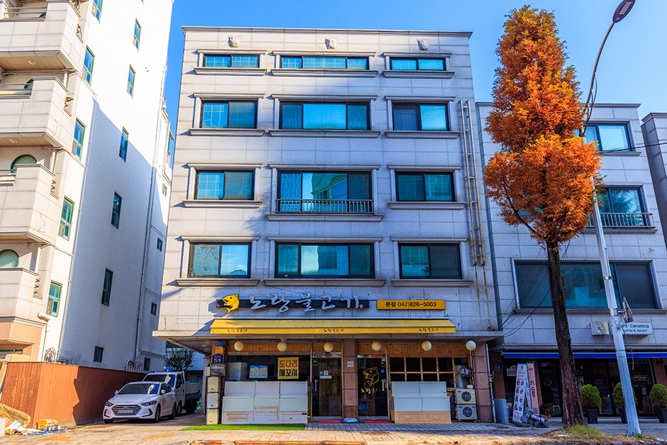 노랑물고기 본점은 대전광역시 유성구 궁동에 있다. 깔끔한 느낌의 외관과 차분한 분위기를 연출하는 인테리어로 이루어졌다. 대표 메뉴는 광어와 우럭 등 각종 생선회다. 이 밖에 가리비, 문어, 소라, 매운탕 등이 준비되어 있다. 여러 가지 해산물 등을 골고루 맛볼 수 있는 노랑물고기 스페샬도 인기가 많다. 유성IC에서 가깝고, 주변에 국립중앙과학관과 대전 엑스포 아쿠아리움이 있다.
