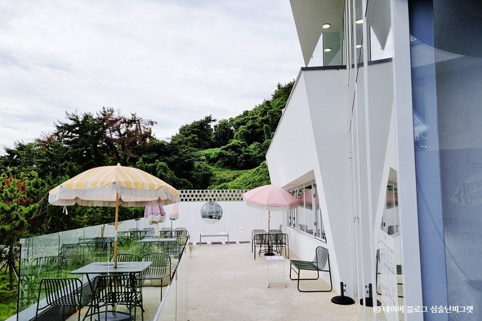 카페 입구에서부터 각 계단에 앉아 바다를 바라볼 수 있도록 의자가 마련되어 있어 캠핑 느낌이 나는 외부 좌석도 있고, 내부는 전체적으로 화이트와 우드 인테리어라 깔끔하고 아늑한 느낌이다. 무료 공영주차장이 있어 주차 걱정 없이 방문할 수 있다. 1호점, 2호점이 있는데 1호점인 본점은 주말과 공휴일에만 문을 열고 2호점은 연중무휴로 운영된다. 특히 루프탑은 햇살이 뜨거운 여름날엔 대형 파라솔이 쳐져 탁 트인 바다를 바라보며 커피 한 잔을 할 수 있다. 생망고, 딸기, 방울토마토, 포도, 청포도를 올려주는 크로플에는 상하목장 아이스크림이 올라가 인기 메뉴다. 2층 실내에서도 통창으로 바라보는 오션뷰를 즐길 수 있다. 유월드 루지 테마파크, 여수갯벌노을마을 등이 주변에 있어 연계 관광하기 수월하다.