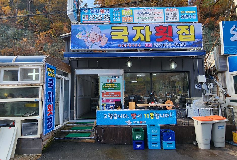 거제 외포항 직판장 앞에 자리한 국자횟집은 신선한 활어회를 사계절 맛있게 먹을 수 있는 곳이다. 봄에는 도다리쑥국과 멸치 회무침, 여름엔 하모 회와 갑오징어 회, 가을엔 전어, 겨울에는 대구 회, 대구찜, 대구탕, 미기 회무침, 미기탕을 맛볼 수 있다. 대표 메뉴는 멸치 회무침, 멸치튀김, 멸치찌개가 무한리필 되는 멸치 회 코스이다. 신선한 재료로 만들어 비린 맛이 없고 부드러운 식감으로 맛이 좋다. 근처에 거제 관광명소 매미성과 두모몽돌해변이 가까이 있어 함께 둘러보기 좋다.