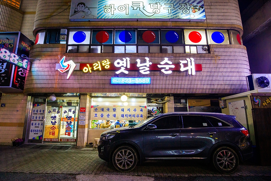 아리랑옛날순대는 대전광역시 유성구 봉명동에 있다. 세월의 흔적이 엿보이는 외관과 차분한 분위기를 연출하는 인테리어로 이루어졌다. 내부에는 단체석이 마련되어 있어 각종 모임을 하기 좋다. 대표 메뉴는 순대국밥이다. 모듬순대, 돼지수육, 돼지머리수육도 판다. 오전 8시에 영업을 시작하기 때문에 여행길에 아침 식사를 하기 제격이다. 유성IC에서 가깝고, 주변에 유성온천공원과 엑스포다리와 가수원교를 잇는 갑천누리길1코스가 있다.