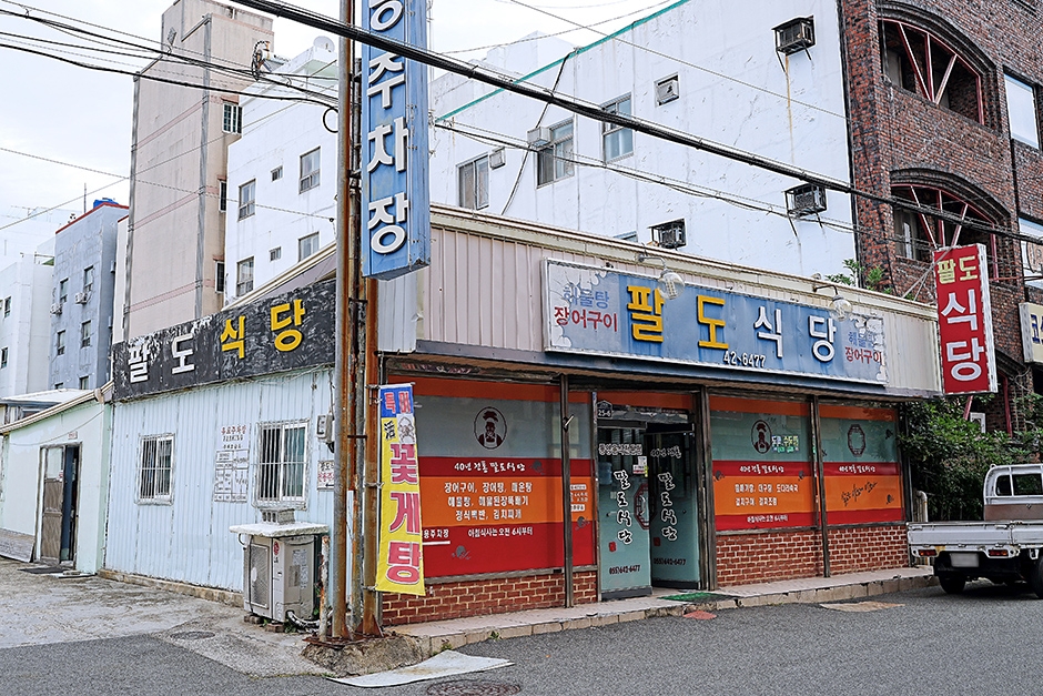 팔도식당은 통영 시내에 있는 40년 전통의 통영 제철 음식점이다. 오랜 세월 같은 자리를 지키며 도다리쑥국과 대구탕 등 맛 좋은 제철 메뉴로 많은 현지인의 사랑을 받아왔다. 전통이 묻어나는 건물의 외관과는 달리, 식당 내부는 깔끔한 편이며, 홀에 테이블 8개와 단체석으로 이용할 수 있는 방도 마련되어 있다. 메뉴는 1인도 주문할 수 있는 김치찌개, 된장찌개, 순두부찌개 등 백반 메뉴와 2인부터 주문할 수 있는 장어구이, 두루치기, 낙지볶음 등이 있다. 계절에 따라 특별한 메뉴를 판매하기도 하는데, 봄에는 도다리쑥국, 여름에는 갈치조림과 열무국수, 가을에는 꽃게탕, 겨울에는 대구탕과 물메기탕을 판매한다. 그 시기에 가장 맛있는 음식 재료를 이용해 만든 메뉴이니 계절의 맛을 느끼고 싶다면 방문하는 것을 추천한다.