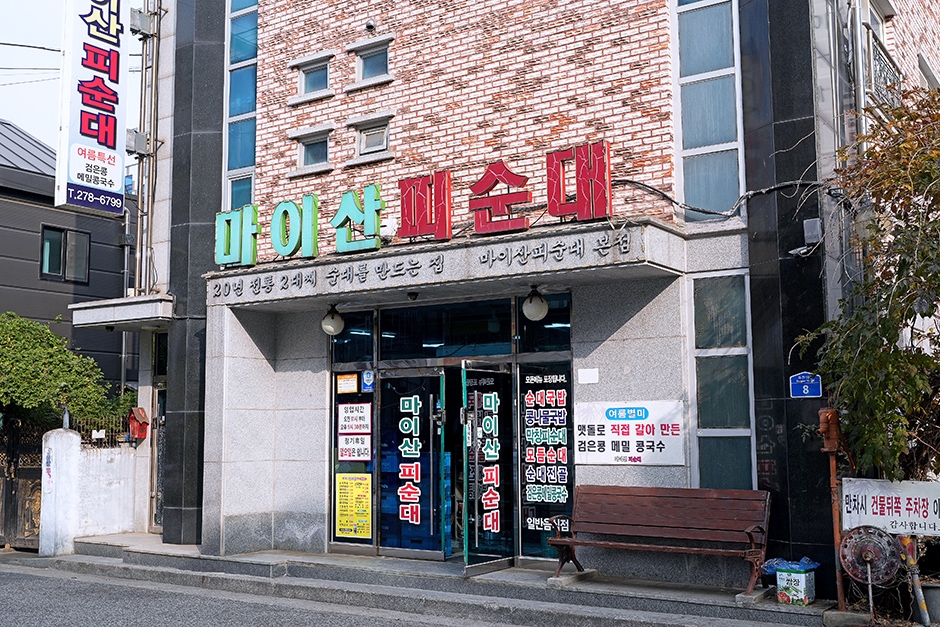 마이산피순대는 전주시 덕진구 송천동에 있는 유명한 순대국밥 전문점이다. 20년 전통으로 2대째 운영 중이며, 주차장은 제2 주차장까지 있을 정도로 평일과 주말 모두 사람이 많은 편이다. 이곳의 피순대는 신선한 채소와 내장으로 매일 아침 손으로 직접 만들어 제공한다. 덕분에 신선하고 고소한 맛에 술안주로 찾는 단골이 많다. 메뉴는 순대국밥과 콩나물 국밥, 모듬순대, 순대전골 등이 있다. 대표 메뉴인 순대국밥에는 고소한 피순대와 내장이 얼큰한 국물이 잘 어우러진다. 순대전골도 막창과 피순대가 고소해 씹히는 맛이 일품이다. 전골을 다 먹고 난 후에는 전골 비빔 공기를 주문할 수 있는데, 남은 국물에 볶음밥을 볶아준다. 인근에 전주덕진공원, 오송제, 전주동물원 등이 있다.