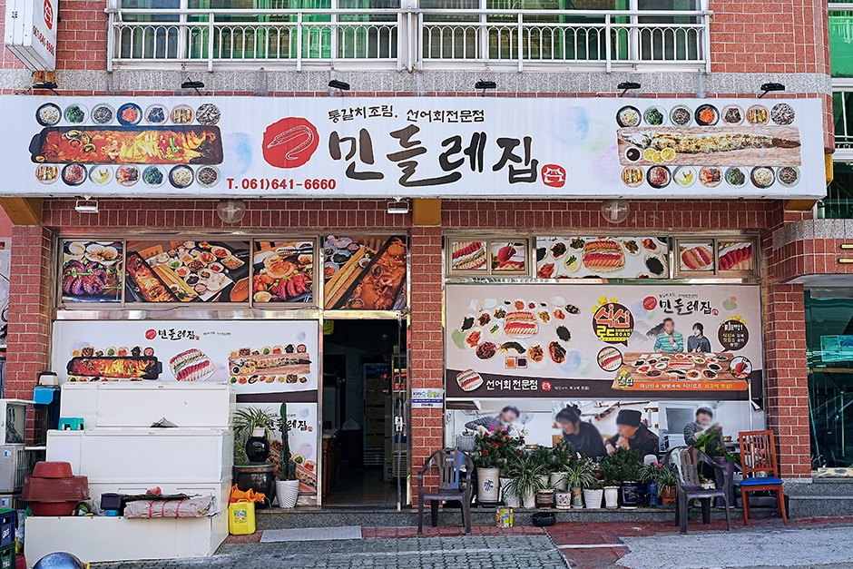 여수맛집 민들레집은 여수엑스포역에서 10분 거리인 봉산 게장 거리에 있는 한식집이다. 선어회와 통갈치조림과 구이가 맛있어 현지인들과 관광객들에게 인기가 좋다. 가게 앞 주차 공간은 협소한 편이라, 인근 공영 주차장 이용을 추천한다. 주로 판매되는 인기 메뉴는 갈치조림과 갈치구이다. 갈치조림은 버너 화구를 2개 이어야 할 정도로 기다란 냄비에 두툼한 갈치 토막과 조개, 문어, 전복 등 다양한 해산물이 함께 나온다. 여기에 국물의 시원함을 더하기 위해 무와 마른 생선을 추가하면 특제 양념이 스며들어 밥과 함께 먹기에 딱 좋은 간을 완성한다. 통갈치 구이 역시 기다란 갈치 그대로의 모습을 바싹하게 구워낸 요리로, 얇은 뼈를 잘 발라 밥에 조금씩 곁들여 먹으면 그 맛이 일품이다. 주변에는 이순신 광장과 여수 예술랜드, 크루즈 선착장 등이 가까이 있어 함께 여행해 보는 것을 추천한다.