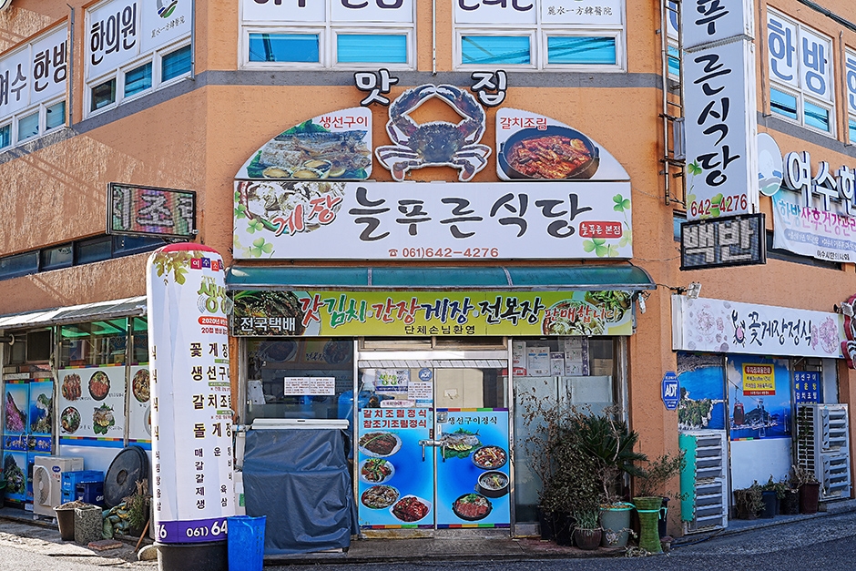 늘푸른식당 게장백반은 봉산 게장거리에 있으며, 여수 엑스포역에서는 차로 10분 거리에 있는 생선구이와 게장 정식 전문점이다. 여수 토박이 음식점 경력 12년 차인 사장님이 운영하며, 매장에서 나오는 모든 반찬을 직접 만들어 특유의 손맛을 느낄 수 있는 곳이기도 하다. 푸짐한 양과 맛 덕분에 현지인들도 즐겨 찾는다. 메뉴는 생선구이 정식과 갈치조림 정식이 대표적이다. 두 메뉴 모두 간장게장과 양념 돌게장이 포함되어 나온다. 전라도의 푸짐한 인심만큼 밑반찬도 매우 풍성하며, 생선구이 주문 시에는 먹갈치, 참조기, 전복, 고등어 등 다양한 생선이 제공된다. 함께 나오는 돌게장은 살이 꽉 차 있고, 집게발도 먹기 좋게 잘려져 있다. 구수한 누룽지로 입가심하면 배부른 한 끼 식사가 완성된다. 주변에는 여수 해상케이블카와 이순신광장 등이 있어 함께 여행해 보는 것을 추천한다.