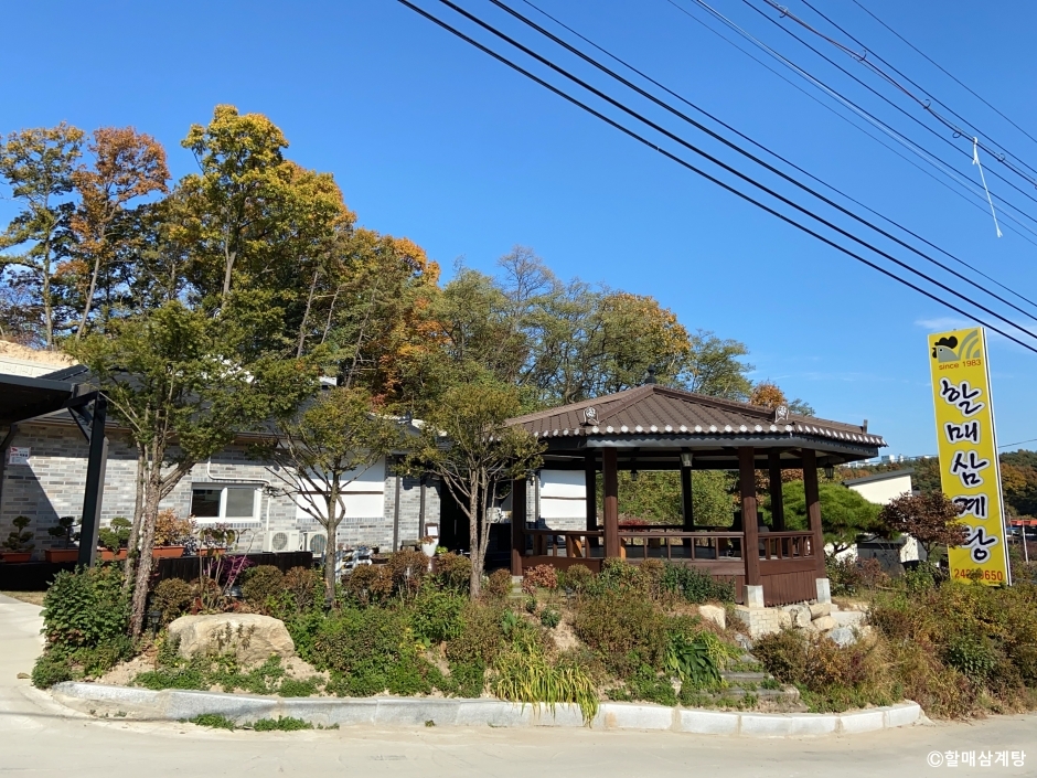 할매삼계탕은 강원도 춘천시에 있는 삼계탕 전문점이다. 잘 지어진 한옥에 넓은 정원을 갖추고 있는 식당이다. 정원을 잘 가꿔 놓은 곳이라 나들이하기도 좋은 곳이다. 삼계탕 종류가 몇 가지인데 그중 오골계 삼계탕은 하루 전에 예약해야만 먹을 수 있다. 기본 삼계탕이 할매삼계탕인데 견과류를 갈아 넣은 국물이 걸쭉하면서도 고소한 맛이 일품이다. 기본 반찬은 총각김치, 배추김치, 생양파와 고추, 된장이다. 장이 참 맛있는 식당이다. 보신 음식이라 그런지 어르신들이 많이 방문하는 식당이다. 시간에 따라 대기가 있을 수 있다. 전용 주차장이 있어 편하게 이용할 수 있다.