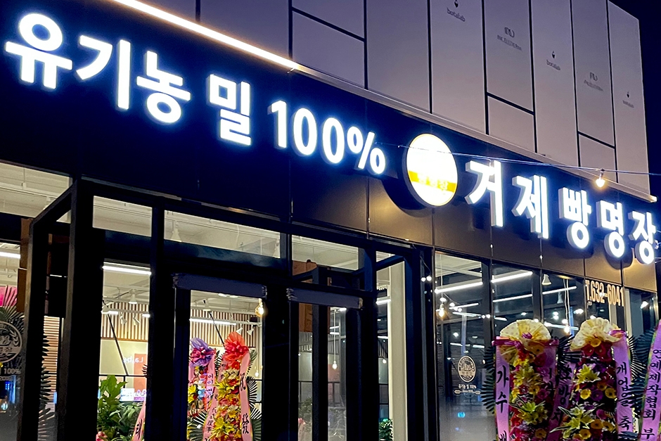 거제빵명장은 유기농 밀 100%를 사용해 빵을 만드는 대형 베이커리다. 거제도를 대표하는 빵집으로 천연효모를 사용해 밀가루에 있는 글루텐 성분을 잠식시킨다. 맛있는 빵을 고객들에게 제공하기 위해 하루 세 번 이상 갓 구운 백여가지가 넘는 빵을 판매하고 있으며 남는 빵은 거제시 자원봉사센터에 기부하고 있다. 시그니처 메뉴인 육쪽마늘빵은 입안 가득 퍼지는 마늘의 풍미와 달콤한 크림치즈가 만나 매력적이다. 실내는 넓고 세련된 인테리어로 꾸며졌으며 테이블 간격이 넓고 여유 공간도 많아 편안하다. 거제도 포로수용소 유적공원이 인접해 있어 함께 둘러보기 좋다.