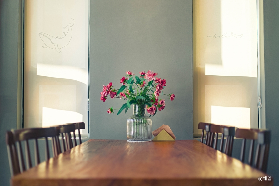 수원시 영통구 법조로에 있는 카페로 내부 곳곳에 고래 그림이 있다. 내부는 깔끔하고 곳곳에 식물을 놓아 내츄럴한 분위기를 연출했다. 천장 층고가 높아 개방감이 느껴진다. 바닥은 에폭시 코팅으로 넓어 보이며 테이블과 의자는 나무로 되어있다. 매장의 앞과 뒤쪽 모두 통창으로 되어있어 개방감이 느껴진다. 커피와 디저트 메뉴가 있으며 매월 스페셜 카페 메뉴를 선보인다. 자정까지 운영하며, 저녁에는 펍을 이용할 수 있어 데이트하기에도 좋은 장소다. 상현역 2번 출구에서 도보 3분 정도로 가깝다.