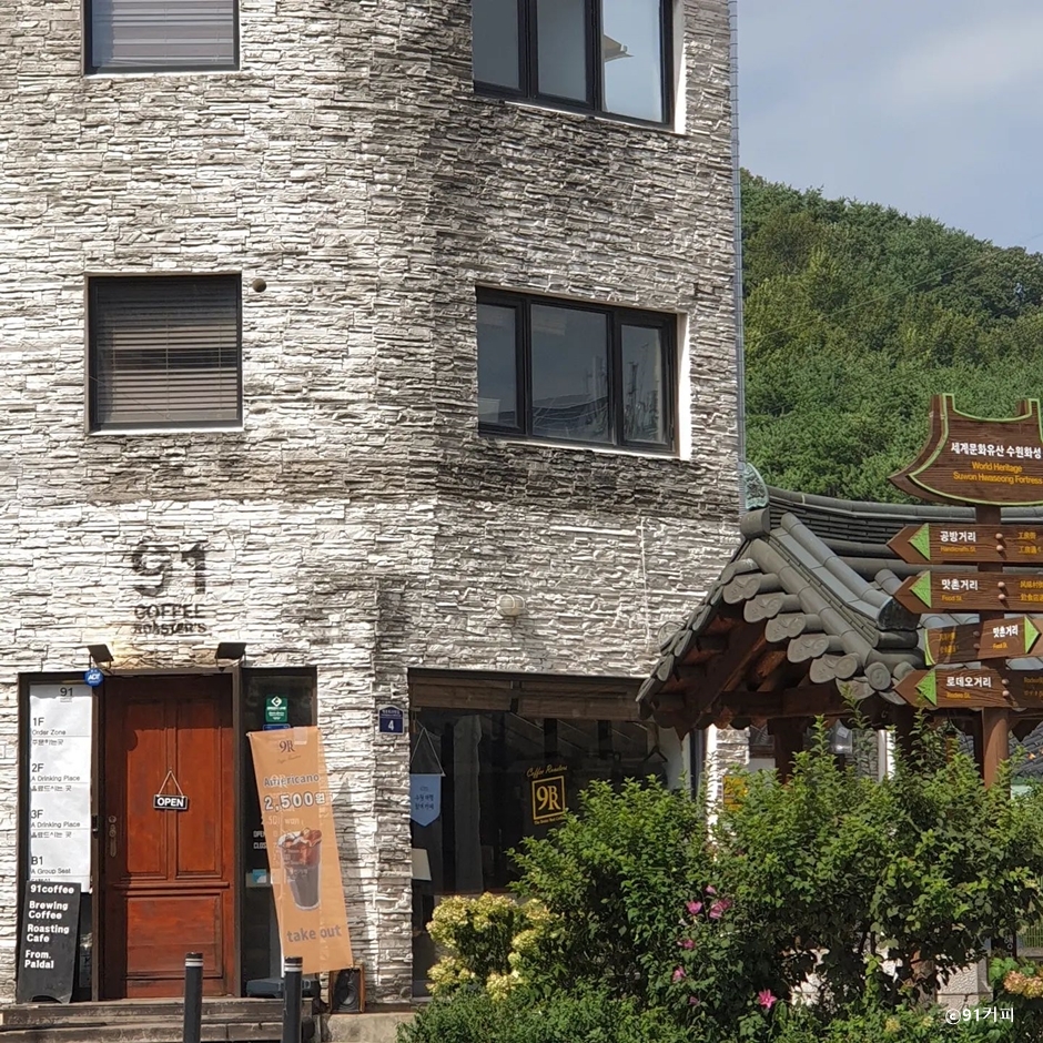 91커피는 수원 화성행궁 옆에 있는 로스팅하는 카페이다. 이 카페는 별도의 주차장이 없어 차량 이용 시 근처 공영주차장을 이용해야 한다. 3층짜리 단독건물로 빈티지한 소품들로 꾸며져 있는 이곳은 1층에는 음료 주문 및 로스팅하는 공간이며, 2층과 3층은 다양한 크기의 테이블이 여유롭게 배치되어 있다. 또한 각종 모임을 할 수 있는 단체석이 지하 1층에 별도로 마련되어 있다. 91커피의 대표메뉴는 달고 고소한 아몬드 향의 부드러운 91라떼 외에도 에스프레소, 아메리카노 플렛 화이트 등의 커피 메뉴와 허브티, 병음료, 에이드 등의 다양한 음료가 있고 바스크 치즈 케이크, 라즈베리 스콘, 누네띠네 스콘 등의 직접 만든 디저트가 준비되어 있다. 근처에는 화성행궁 외에도 공방 거리, 수원통닭거리 등의 다양한 볼거리와 먹거리가 있다.