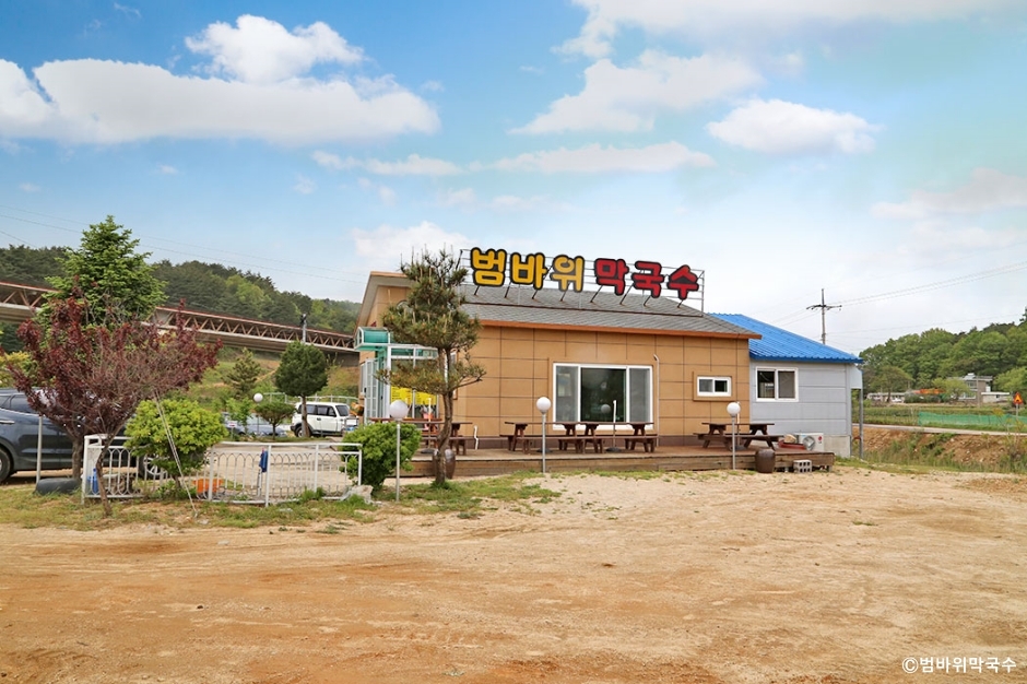 범바위막국수는 강원도 속초시에 있는 막국수 전문점이다. 척산 온천 근처에 있어 온천욕을 즐긴 후에 시원한 막국수를 먹으러 들를 수 있는 곳이다. 막국수는 주문받으면 바로 제면해서 조리한 후 제공하고 있어 주문하고 난 후에는 변경이 어렵고 서빙까지 시간이 걸리는 편이다. 회 막국수에 올라가는 고명이 가자미회가 많은데 이 집은 대관령의 특산물인 명태회를 올려 주는 곳이다. 명태회가 막국수의 감칠맛을 더욱 높여 준다. 곁들임 메뉴로는 수육, 메밀찐만두, 찰수수부꾸미, 오징어순대가 있어 다양하게 즐길 수 있다. 주차는 매장 앞에 큰 전용 주차장이 있어 이용이 편리하다.