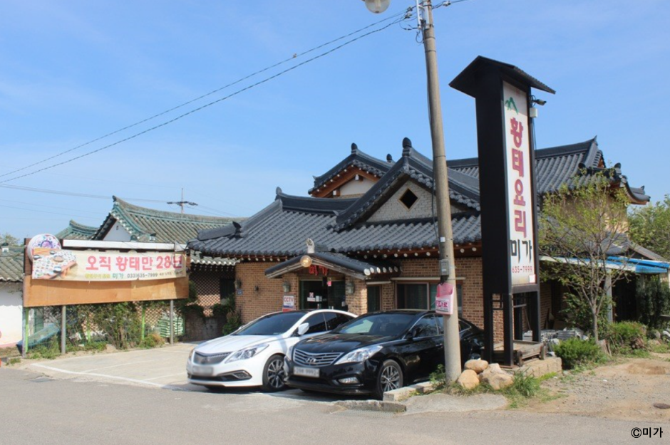 미가는 강원도 속초에 있는 황태구이 맛집이다. 서울 양양 고속도로를 빠져나오는 곳에 있어서 서울에서 일찍 출발한 여행객이 아침 식사를 하러 가기 좋은 곳이다. 아침부터 영업하는 식당이라 아침밥을 먹는 고객이 많아서 반찬이 모두 집에서 먹는 것과 같은 알찬 구성이다. 주메뉴는 황태구이 정식과 더덕구이 정식으로 황태구이와 더덕구이는 빨갛게 양념해서 불맛을 냈는데 촉촉하고 매콤 달콤한 맛이다. 황태나 더덕의 원래 맛을 간직하면서도 맛있는 양념이 잘 배어 있다. 정식에는 황탯국이 같이 나오는데 뽀얀 국물이 진국이다. 전용 주차장이 있으나 빈자리가 없으면 주변 골목이나 도로변에 주차를 할 수 있다.