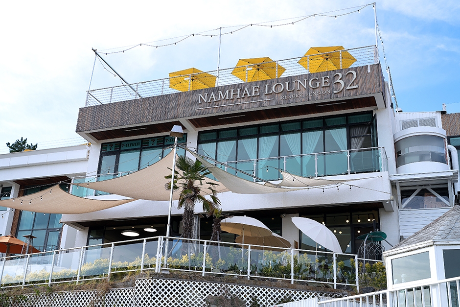 남해라운지32는 남해의 옥빛 바다와 금색 모래사장이 아름다운 두곡 해수욕장을 바라보는 오션뷰 카페다. 카페 건물 바로 옆은 라운지32 리조트로, 매년 여름휴가를 즐기려는 관광객들이 많이 찾는 곳이기도 하다. 카페는 총 3층 규모로 큰 편이며, 1층과 2층은 실내 매장으로 운영되며 3층은 루프탑으로 운영한다. 특히 루프탑에는 바다가 한눈에 보이는 인피니티 풀과 파라솔, 노란색으로 포인트를 준 선베드가 있어 휴양지에 온 듯한 분위기를 연출했다. 카페와 리조트 이용객만 출입할 수 있으니 참고하면 된다. 이 카페는 뷰만큼이나 새우아란치니, 부라타샐러드 등의 브런치 메뉴와 에그타르트, 휘낭시에와 같은 디저트 메뉴도 맛이 좋다. 반려동물도 출입할 수 있어 반려견과 함께하는 남해 여행을 할 수 있다.