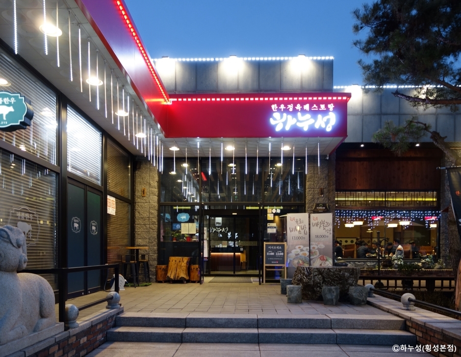 하누성 횡성본점은 강원도 횡성군 둔내면에 있는 한우전문점이다. 쇼케이스에 한우를 부위별로 포장해 놓은 것을 보고 골라서 구워 먹을 수 있는 식당이다. 이곳은 한우 투플러스만 취급하는 식당으로 고기의 품질이 매우 좋다. 주변에 둔내스키장도 있고 오크밸리, 웰리힐리 리조트도 있어 가족 동반 손님이나 라운딩을 나온 골퍼들이 많이 방문한다. 고기를 고르고 자리를 잡으면 맛있는 밑반찬과 숯불을 가져온다. 적당한 기름에 육즙이 배어 나오는 고기의 맛이 뛰어나다. 매장에서 먹은 고기는 쇼케이스에서 골라 포장해 갈 수도 있다. 주차는 매장 앞에 전용 주차장이 있어 이용이 편리하다.