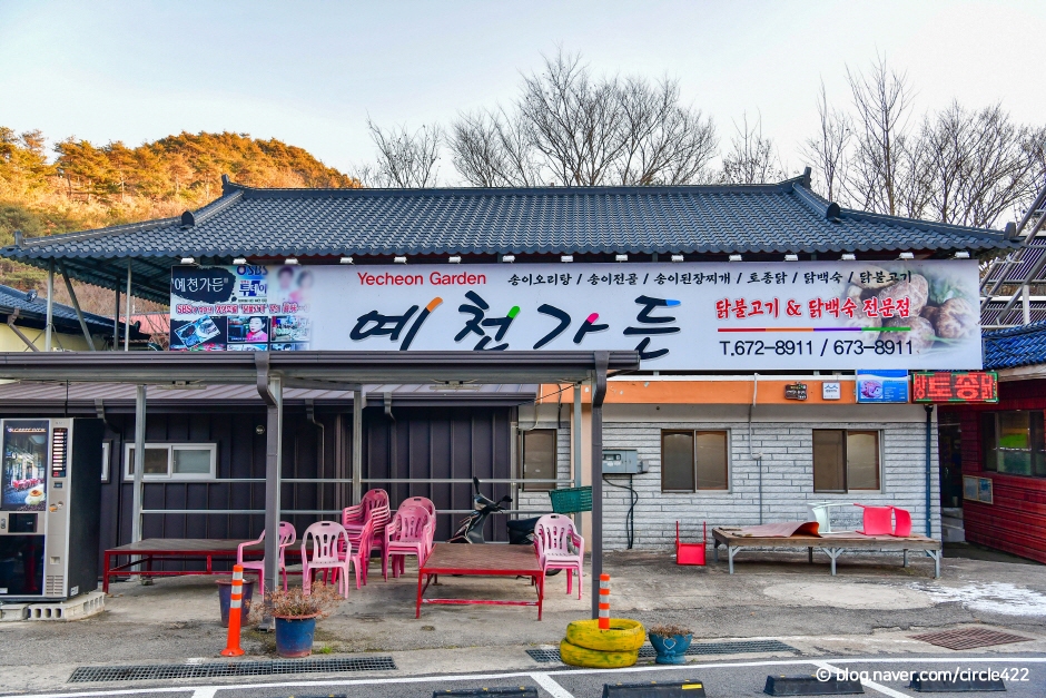 예천가든은 경상북도 봉화군 봉성면 우곡리에 있다. KBS 2TV 시사 교양 프로그램 생생정보에 소개된 바 있다. 고풍스러운 멋을 풍기는 외관과 예스러운 분위기를 연출하는 인테리어가 눈에 띈다. 내부에는 단체석이 마련되어 있어 각종 모임을 하기 좋다. 대표 메뉴는 오리탕이다. 이 밖에 능이 토종닭, 토종닭, 오리 주물럭, 송이구이, 송이전골, 된장찌개 등 여러 가지 요리가 준비되어 있다. 오전 7시에 문을 열기 때문에 아침 식사를 하기 좋다. 풍기IC에서 가깝고, 주변에 국립백두대간수목원과 문수산 자연휴양림이 있다.
