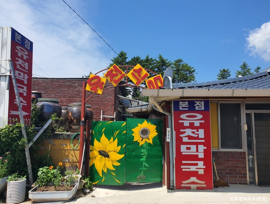 유천막국수 본점은 강원도 평창군에 있는 막국수 전문점이다. 메밀이 많이 나는 평창에서 막국수 집은 흔하지만, 이곳은 한곳에서 오랫동안 같은 맛을 유지하고 있어 2014년부터 블루리본 서베이에 맛집으로 계속 등록되는 맛집이다. 3대째 내려오는 씨간장을 이용해 육수를 만들어 깊은 맛이 배어 있다. 막국수 외에도 도토리 묵사발, 꿩 만둣국과 같은 강원도 토속 음식을 모두 맛볼 수 있는 강원도 향토 음식점이다. 매장은 예전 시골 주택을 개조해서 개업 때부터 지금까지 사용하고 있다. 주차는 매장 앞에 하면 되고 빈자리가 없는 경우에는 근처 길가에 주차하면 된다.