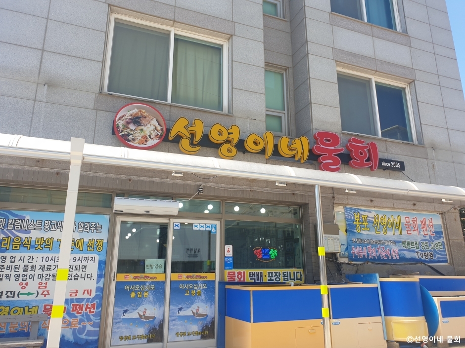 선영이네물회는 강원도 고성군에 있는 소문난 물회 맛집이다. 재료가 신선하고 양이 푸짐해서 매장에서 먹는 고객들도 많지만 관광지에 숙소를 잡아 놓고 포장을 해가는 손님들도 많다. 가장 인기 있는 메뉴는 특선영물회이다. 제철 해물을 푸짐하고 다양하게 넣어 제공한다. 물회를 주문하면 해초면과 양념 등 밑반찬도 함께 나온다. 특별 메뉴 삼겹살을 주문하면 물회에 싸 먹을 수 있게 구워 나오는데 구운 삼겹과 싸먹는 물회의 맛이 별미이다. 제철 해산물을 이용하는 오늘의 회도 인기 메뉴 중 하나이다. 주차장은 매장 앞에 있으나 펜션을 함께 운영하고 있어서 항상 복잡하다. 만차일 경우 주변 이면도로나 공영주차장, 봉포항 주차장을 이용한 뒤 방문할 수 있다.