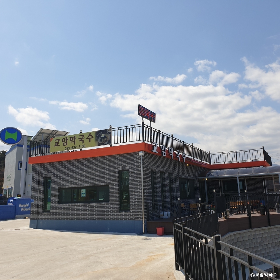 교암막국수는 강원도 고성군에 있는 막국수 전문점이다. 아야진 해수욕장, 백도해수욕장, 교암해수욕장과 멀지 않아 여행객들이 많이 찾는 맛집이고 현지인들 사이에서도 유명하다. 메뉴는 메밀국수, 수육, 명태식해가 전부이다. 수육을 주문하면 명태식해, 백김치, 새우젓이 함께 나온다. 막국수는 비빔이나 물로 구분하지 않고 메밀국수로 판매하는데 여기에 동치미 육수, 양념장, 들기름을 넣어 취향껏 즐기면 된다. 처음에는 들기름을 약간 넣어 열무김치와 먹고 두 번째는 비빔장을 넣어 비빈 뒤 명태식해와 백김치와 함께 먹는다. 마지막으로 남은 국수는 시원한 동치미 육수를 부어 먹는데 어떤 방법으로 먹든 최상의 맛을 경험할 수 있다. 주차는 매장 앞에 넓은 전용 주차장이 있어 주차가 편리하다.