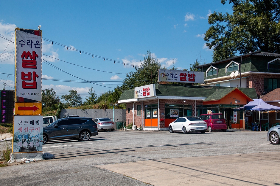 수라온쌀밥은 경기도 여주시 가남읍에 있는 한정식 전문점이다. 소박하고 깔끔한 내부가 편안한 느낌이다. 분리된 공간의 방도 있고 단체석도 있다. 수라온 (한상/ 정식/ 밥상)은 모두 4인 기준의 식사로 한 상이 차려진다. 대표 메뉴인 수라온 한상은 고등어구이와 제육볶음, 황태구이, 갈치구이, 1인용 가마솥밥이 다양한 밑반찬들과 함께 나온다. 살이 두툼한 고등어는 잘 구워져서 속이 촉촉하면서 고소하다. 제육볶음은 매콤달콤한 맛에 양이 푸짐하며 육즙이 좋다. 불향을 입혀 구운 황태구이는 맛있는 소스가 잘 입혀졌고, 살이 통통한 갈치는 고소하고 담백하다. 밑반찬들도 정갈하게 잘 차려져 나온다. 오전 6시부터 영업을 시작해 골프장을 찾는 손님들이나 이동하는 기사들이 아침 식사를 하기에도 좋다. 2km 거리에 태평근린공원, 5km 거리에 해봄한옥체험관, 6km 이내에 다수의 골프장이 있다.