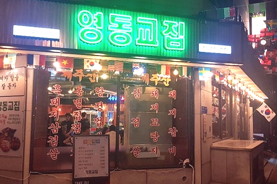 영동교집 청담직영점은 지하철 수인 분당선 압구정 로데오역 4번 출구 학동사거리 부근에 있다. 매장이 있는 상가건물에 자체 주차장(발레파킹 서비스 가능)이 있어 방문 시 자동차로 이용하기 편리하다. 이곳은 방송사 맛집 TV 프로그램에 흑돼지 냉동 삼겹살 맛집으로 소개되었다. 매장 내부는 넓은 홀에 인원별 다양한 테이블 구성이 가능해 단체 행사나 직장 회식에 적당하다. 대표 메뉴로 제주산 흑돼지 삼겹살, 제주산 통 벌집 껍데기, 제주산 삼겹살, 돼지 꼬랑지가 있다. 이외 메뉴로 제주돗순두부찌개+비빔밥, 시골 청국장+비빔밥, 눈꽃 치즈돈가스 정식, 고사리 소고기 해장국이 많이 나간다. 주변에 압구정 로데오거리, 도산공원, 압구정 카페골목, 청담동 명품거리가 있어 연계 관광을 할 수 있다.