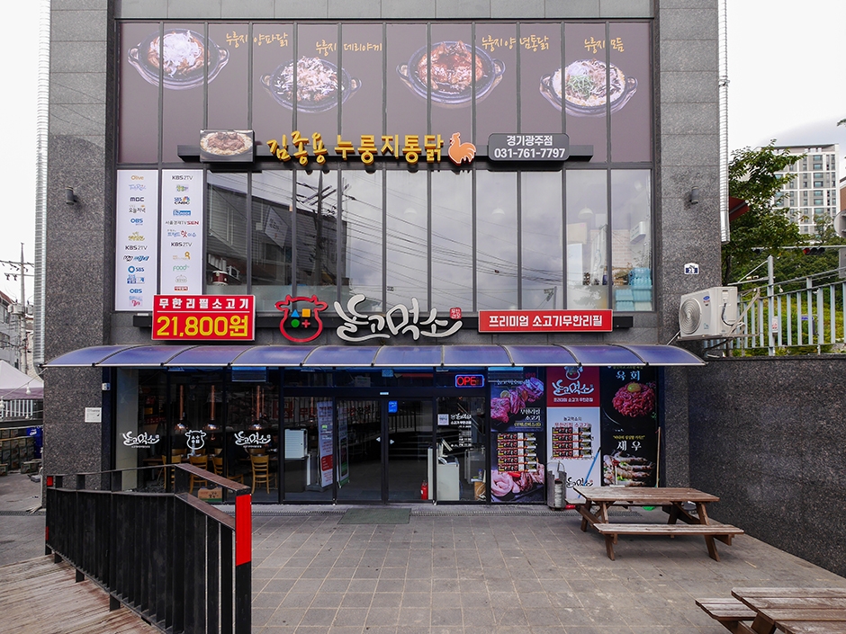 놀고먹소는 경기도 광주시 장지동 대광프라자 건물에 있는 프리미엄 소고기 무한리필집이다. 지하와 지상에 150대 수용 할 수 있는 넓은 주차장이 있어 편하게 주차를 할 수 있다. 주차 이용 시간은 3시간으로 식당에서 식사 후 계산 시 주차권을 받으면 된다. 가성비 좋은 무한리필집으로 깔끔하고 넓은 내부에 테이블이 많아 회식 및 단체모임을 할 수 있다. 주문 후 이용 시간은 2시간이며, 추가로 밥과 반찬을 편하게 가져다 먹을 수 있는 셀프바가 있다. 또한 어린이를 동반한 가족을 위한 놀이시설도 구비되어 있다. 이 식당은 근처에 경강선 경기광주역이 있어 대중교통 접근성이 좋다.