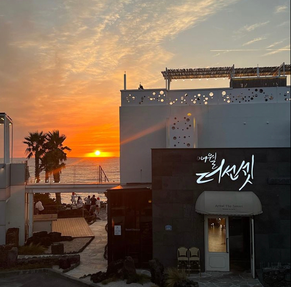 애월더선셋은 한담해변산책로 위쪽 일주서로에 있다. 바다가 보이는 작은 브런치 카페인데 차림새도 화려하고 카페 내부, 외부, 루프탑 어디에서나 풍경이 좋아 여행자들의 포토존 카페이기도 하다. 카페 아래쪽의 해안 산책로와 이를 걷는 사람들을 구경할 수 있고, 일몰에는 바다 노을이 아름답다. 애월더선셋 리조트와 애월더힐을 함께 운영하고 있으며, 주변 여행지로 곽지해수욕장, 한담해안산책로(장한철산책로), 연화지 등이 있다.