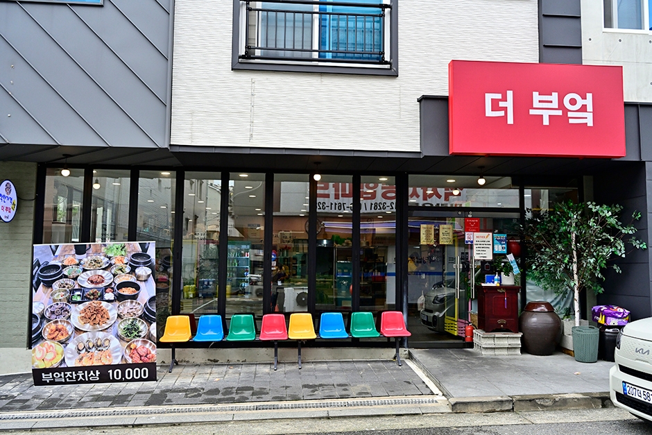 김해 율하 카페거리 안쪽에 있는 더부엌은 상다리가 휘어질 듯 테이블을 꽉 채운 한상차림으로 유명하다. 주차는 카페거리 곳곳에 하거나 바로 옆 율하천변에 할 수 있다. 8개의 테이블이 놓여 있는 크지 않은 규모에 가성비가 좋아 대기가 많으며 배달도 가능하다. 합리적인 가격에 전복, 새우튀김, 제육볶음, 잡채, 김치찜, 꽃게 된장찌개 등과 다양한 나물의 기본 찬이 제공되는데 추가 주문 메뉴를 제외하고는 무제한 셀프 리필이 가능하다. 근처에 반룡산과 롯데워터파크 등이 있어 가족과 함께 나들이 후 들르기 좋다.