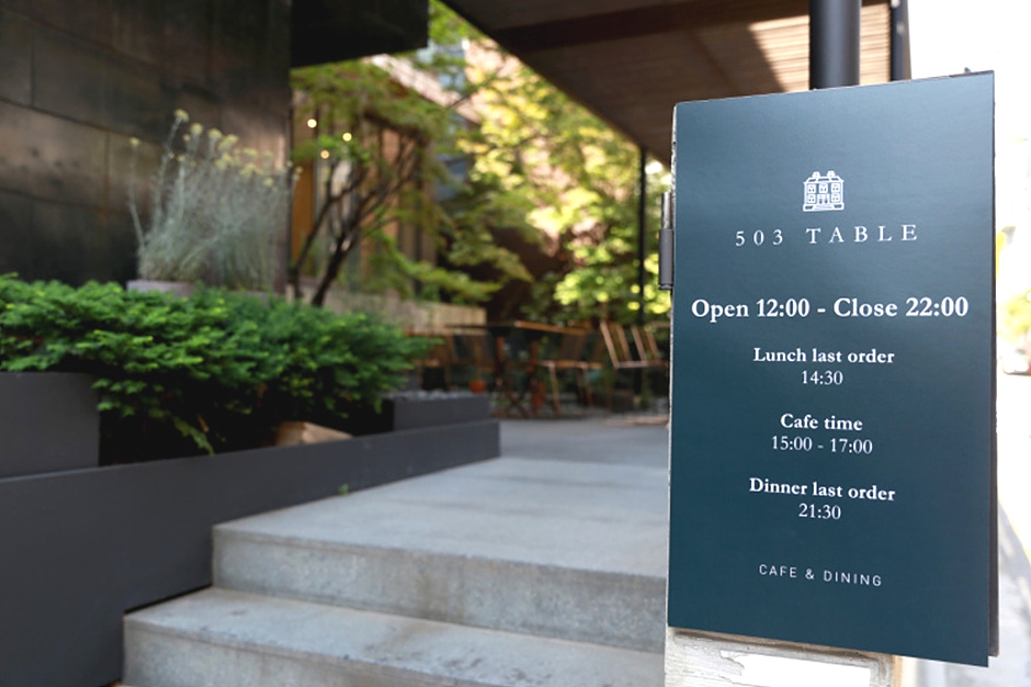 503Table은 서울지하철 9호선 신반포역 4번 출구 부근에 있다. 매장이 있는 상가건물에 자체 주차장(발레파킹 서비스 가능)이 있어 방문 시 자동차로 이용하기 편리하다. 매장 안으로 들어서면 넓은 홀에 고급스러운 이탈리아풍의 모던한 인테리어가 느껴진다. 테이블 사이사이 여유도 많아 각종 단체 행사나 사적인 모임에 적합하다. 대표 메뉴는 한우 트러블 카르파초, 해산물 토마토 스튜, 제철 생선 스테이크, 보타르가 어란 우니 파스타가 있고 그 외 메뉴로 뽈뽀 샐러드, 503레스토랑 식전 빵&버터가 있다. 주변에 서리풀공원이 있어 식사 전후에 둘러보기 좋다.