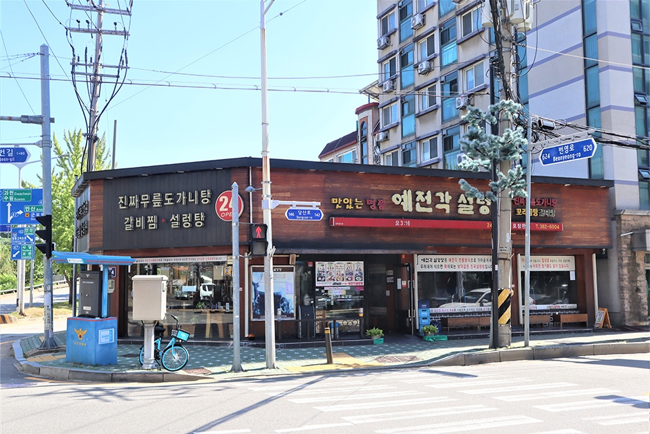 예전각설렁탕은 경기도 군포시 금정동에 있는 한식당이다. 대표 메뉴는 설렁탕이다. 예전각 전통 방식으로 첨가물을 넣지 않고 사골, 무릎도가니, 족, 사태, 양지 등을 가마솥에서 우려내어 식으면 묵이 된다. 진한 국물이 특징이다. 이외에도 선지해장국, 갈비탕, 무릎도가니탕, 꼬리곰탕 등을 판매하고 있다. 매장 내부는 넓고 쾌적하다. 매장 앞에 주차 공간이 있어 편하게 이용할 수 있다. 지하철 1호선, 4호선 금정역 4번 출구에서 955m 떨어져 있어 도보로도 방문할 수 있다.