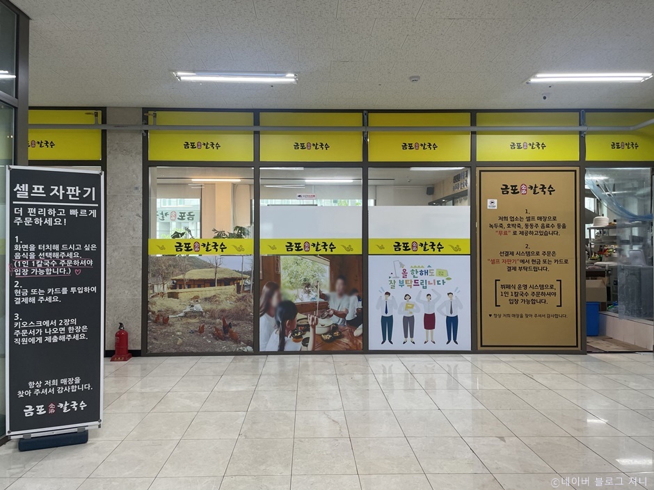 금포칼국수는 김포 장기동 라베니체 근처 줄리아 레스토랑 건물 2층에 있다. 건물 지하에 자체 주차장을 갖추고 있어 편리하게 이용할 수 있다. 입구에 있는 키오스크를 통해 셀프로 주문하면 된다. 이 식당의 장점은 막걸리/동동주를 비롯하여 녹두죽, 호박죽, 공깃밥, 탄산음료, 커피까지 모두 무한 리필로 제공된다. 기본 반찬은 직접 셀프바를 이용해야 하며, 이용 시간은 1시간 30분으로 제한된다. 고구마, 감자, 옥수숫가루를 혼합해서 직접 뽑은 탱글탱글한 생면과 잘게 찢은 닭고기로 만든 닭칼국수를 즐길 수 있다.