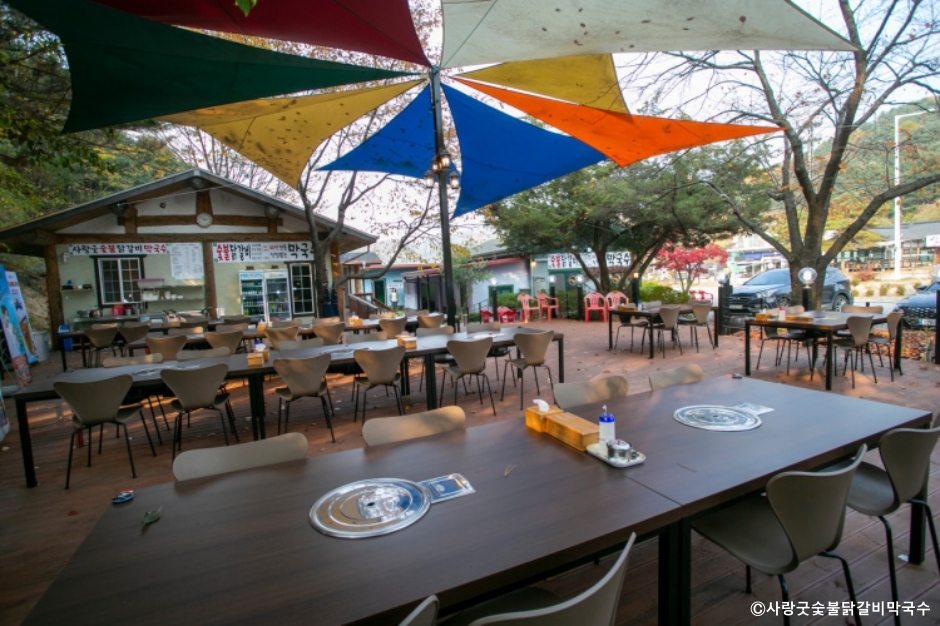 사랑굿 숯불닭갈비막국수는 가평군에 있는 막국수 닭갈비 전문점으로 40년 전통을 자랑하는 맛집이다. 주메뉴는 막국수로 비빔 막국수, 물 막국수 중 하나를 선택할 수 있고, 겨울에는 막국수를 온 국수로 먹을 수도 있다. 닭갈비는 고추장, 간장, 소금 중에 선택할 수 있고 숯불로 초벌을 해서 제공한다. 닭갈비를 먹는 고객은 적은 양으로 나오는 후식 막국수를 주문할 수도 있다. 계절 메뉴로 만두전골과 손두부 버섯전골이 준비되어 있다. 풍광이 좋은 야외 좌석이 넓어 11월까지는 밖에서 식사하는 손님들이 많다. 주차는 매장 바로 앞에 가능하다. 주변에 리엔CC와 썬힐CC가 있어 골퍼들이 많이 찾는 맛집으로 아침고요수목원도 멀지 않은 곳에 있다.